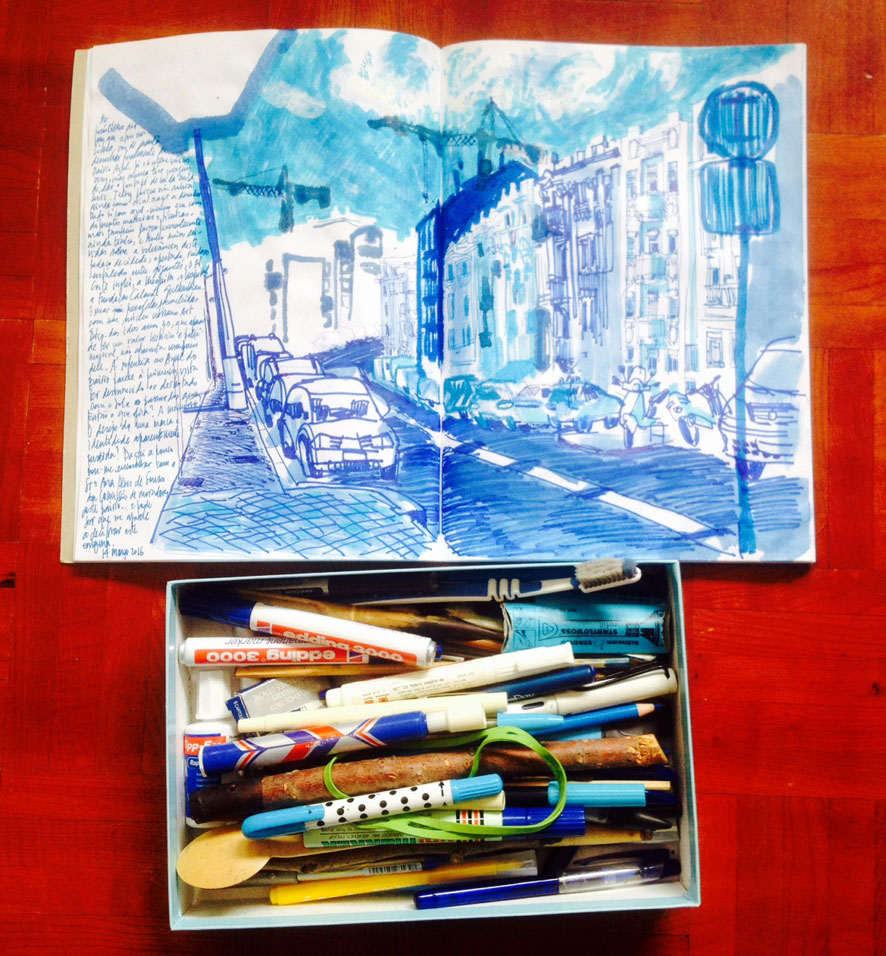 This exhibition of Richard Câmara´s notebooks, concerning the past 10 years of his work, experiences and travelling, between Lisbon and Madrid, takes place at Camões Library from October 10th to November 6th 2015. At the opening and closing of this event, all notebooks will be in open cabinet showcases, free to be handled by visitors. In the remaining days, every notebook will be opened successively on a different page, so that this show changes every day while opened to the public. One of these sketchbooks with original drawings made in Madrid has been selected by the author to be drawn through a raffle system, which can be bought for the symbolic price of 2 € (2,25U$Dollars). On Friday, November 6th, the very last day of the show, at 8:30 p.m. (Lisbon time), the draw will be held in the exhibition hall of the library.